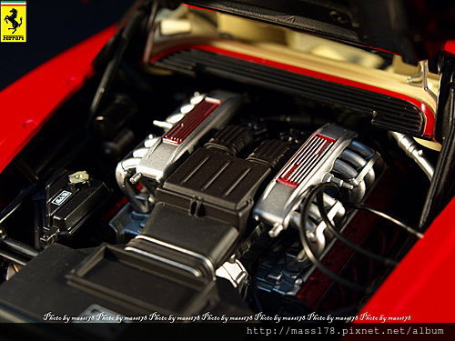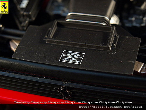 引擎蓋由於為了整體真實性使用小狗腿機關,開關太多次會有鬆掉的疑慮,當然若是跟芭比一樣做成大狗腿開幾次都沒問題啦。引擎部分可以看到整顆上下半部以及管線,當然該"紅頭"的地方是一定有的。